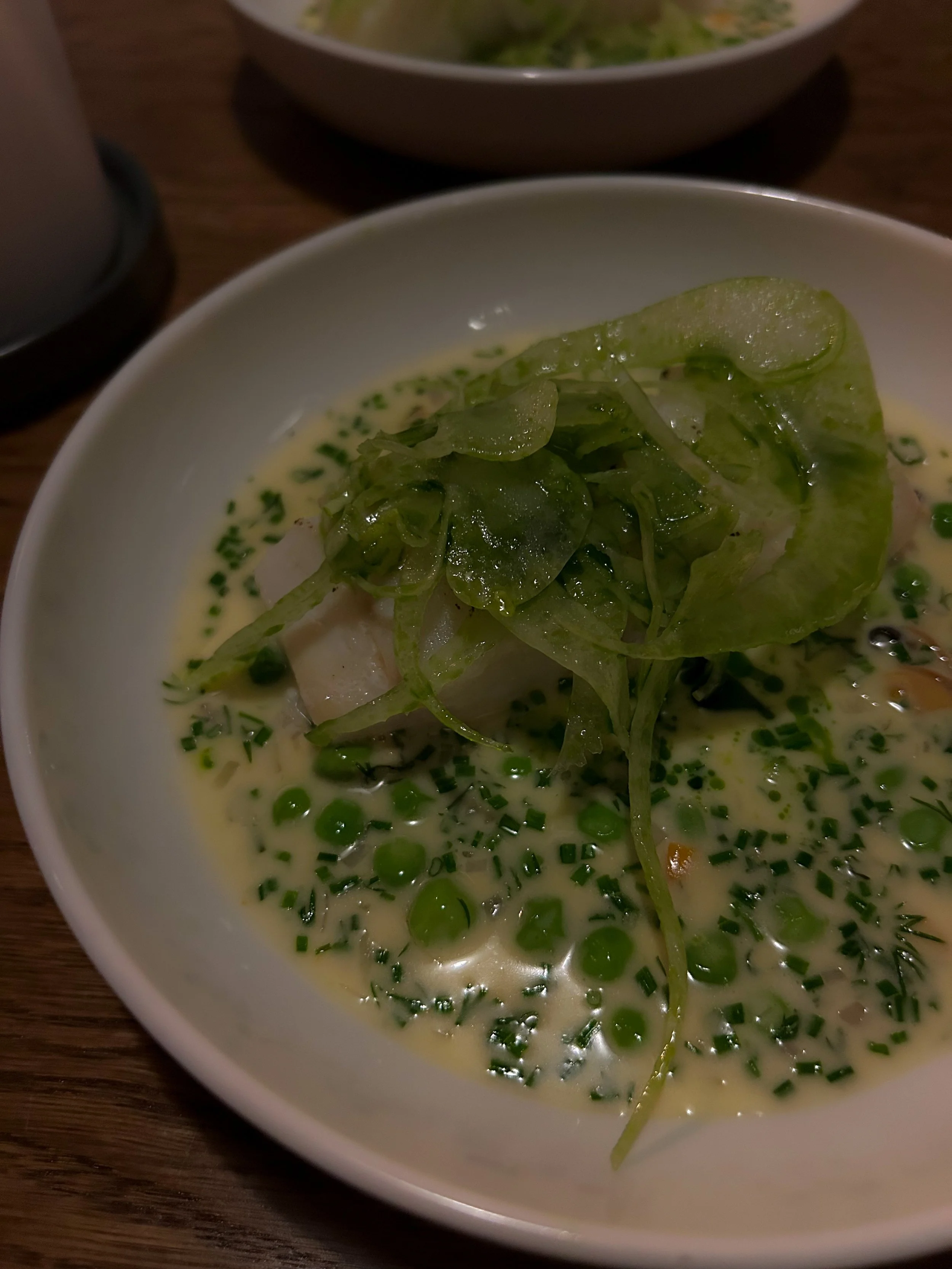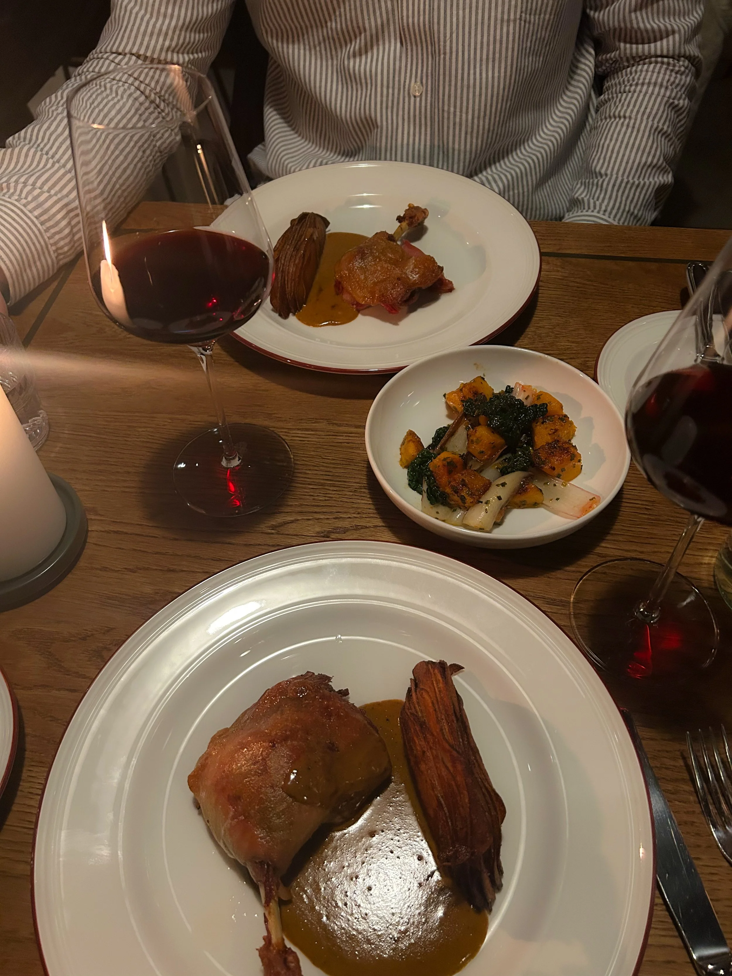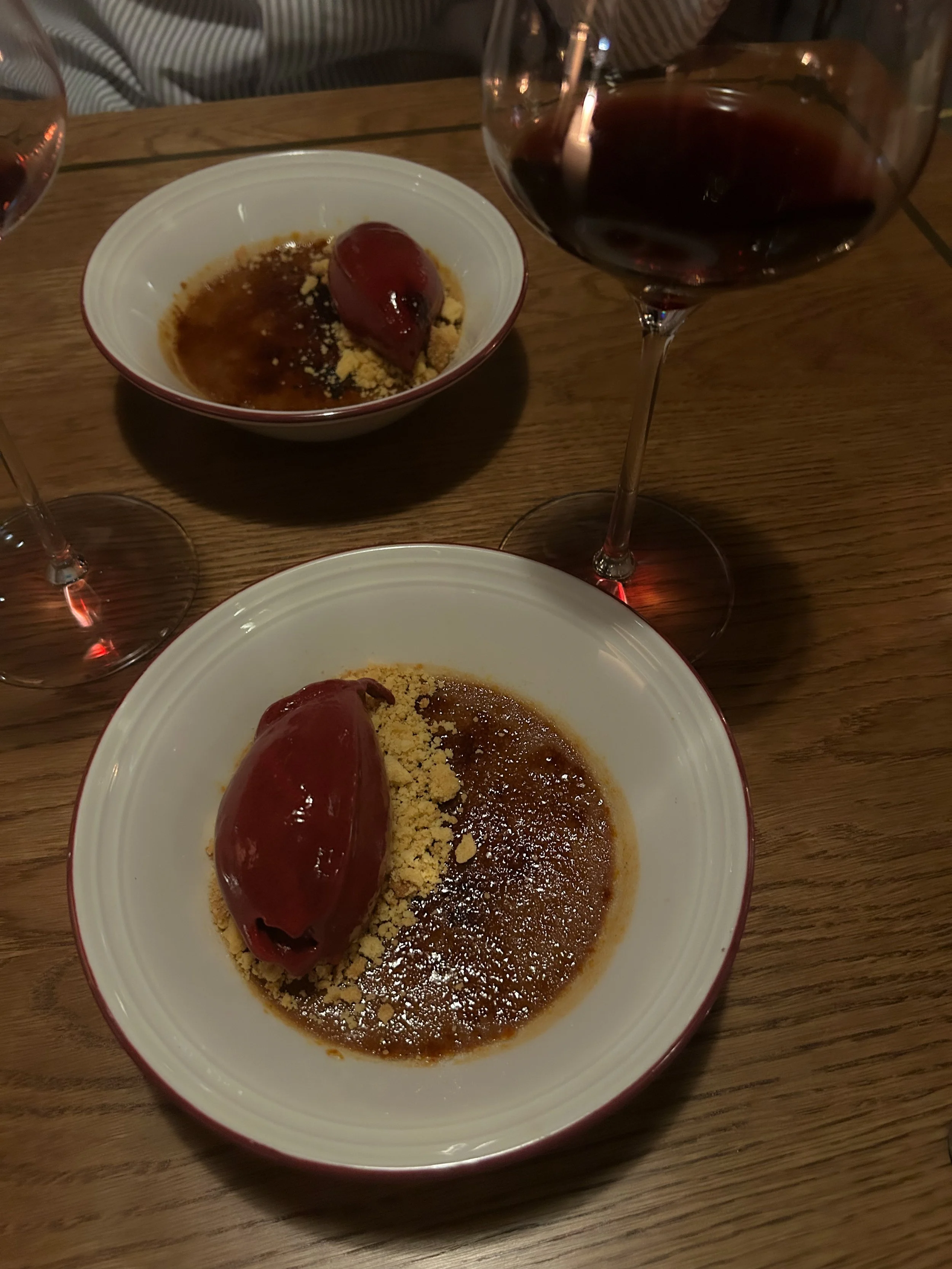 Til forrett fikk vi Bakt Torsk med fenikkel og blåskjellfrikasse. Denne hadde en kjempe god smak og var perfekt før hovedretten; Andelår med peppersaus og sprø poteter, en allsidig favoritt hvor vi også tok et glass rødvin hver ved siden av. Det hele ble avsluttet med en frisk og spenstig dessert, Melkesjokolade Créme Brulée med sorbet, nam!