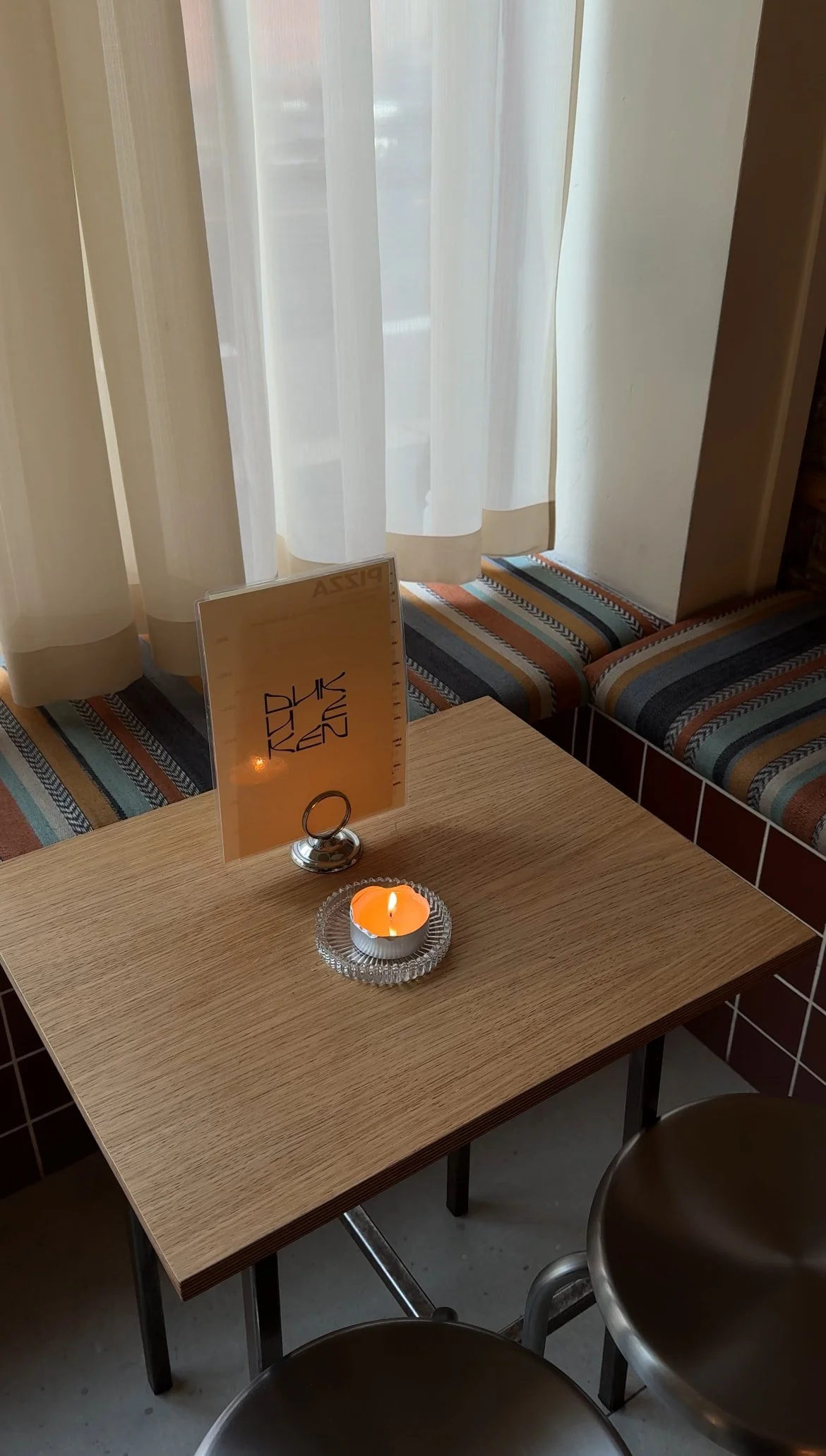 Langs vinduene står små trebord med utsikt mot gata, og bakover i lokalet fortsetter den varme stemningen med lav musikk og prat i bakgrunnen. Her bestiller du både pizza og drikke i baren, og henter bestikk og servietter selv, akkurat slik en uformell nabolagsbar bør være.