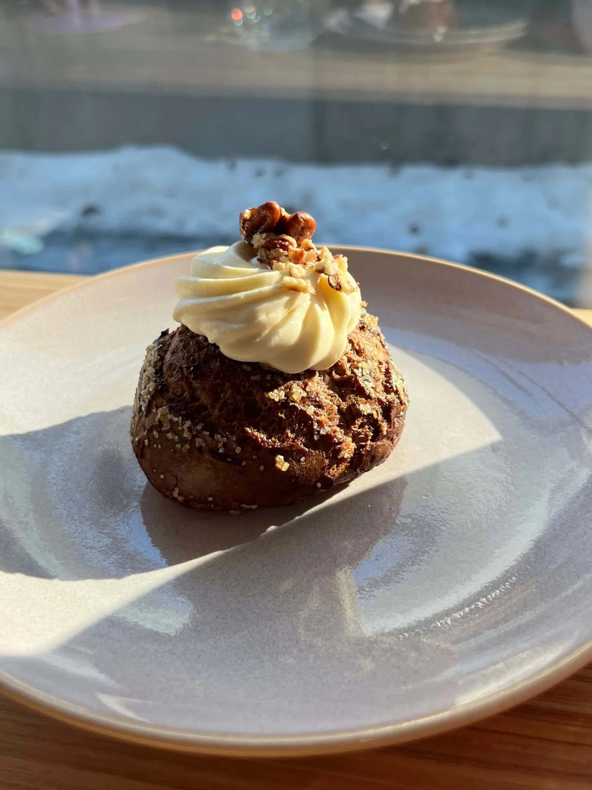Etter å ha stirret litt for lenge på de ulike fristelsene, endte vi opp med å bestille choux (85 kr) og en bringebærmousse (109 kr). Chouxen, en type vannbakkels fylt med krem, var her fylt med hvit sjokoladekrem og pekanpraline (vi lengter fortsatt tilbake til denne..). Bringebærdesserten var frisk og lett, med bringebærmousse og pistasjbunn, og så like bra ut som den smakte.