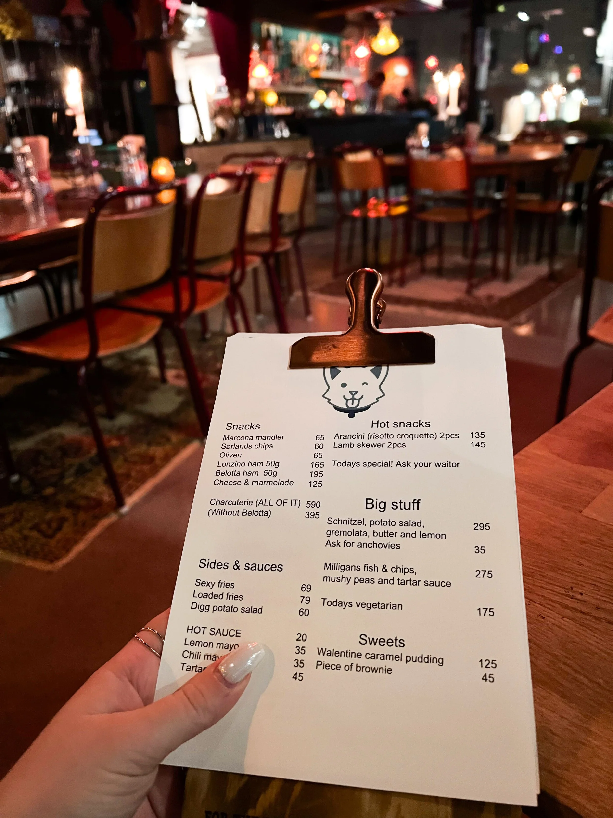 Som lillebroren 100 har de et frekt utvalg av viner som du nesten ikke får sett eller hørt andre steder, det reflekterer også prisen jo mer man blar i vinkartet. Vi holdt oss på førstesiden og ble skjessen på to spanske, en hvit Guimaro Blanco (160 kr) og en rød Naked Henrick (140 kr). Den røde naturvinen er kraftig og har syrlige noter, den hvite er en deilig tørr variant.