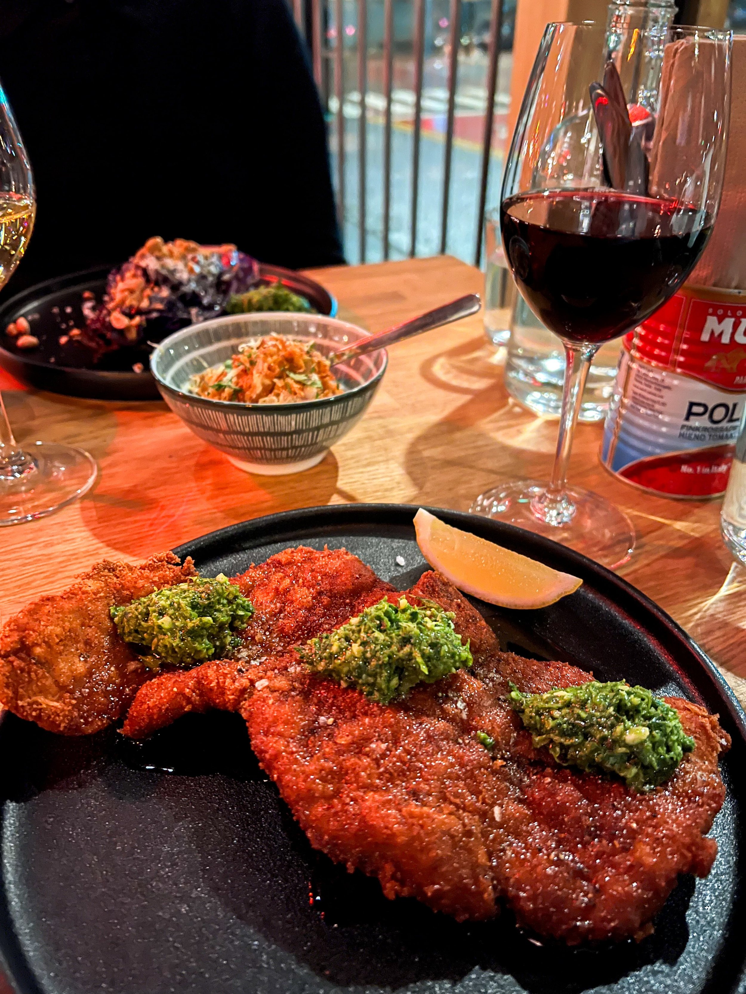 Med rumlende mage ser vi over menyen. Vi har allerede hørt rykter om en Schnitzel signaturrett, som har gjort oss nysgjerrige. Snackslista er full med salt fristelser som mandler, oliven, chips, skinke og ost (65 - 195 kr) Blir man frista av hele lista, kan man bestille det hele på en fjøl for 590 kroner. (Uten Bellota skinke, kan man få den til 385 kr). Det er også flere sides og hot snacks man kan velge, fra loaded fries til arancini (fylte, friterte risottoballer).