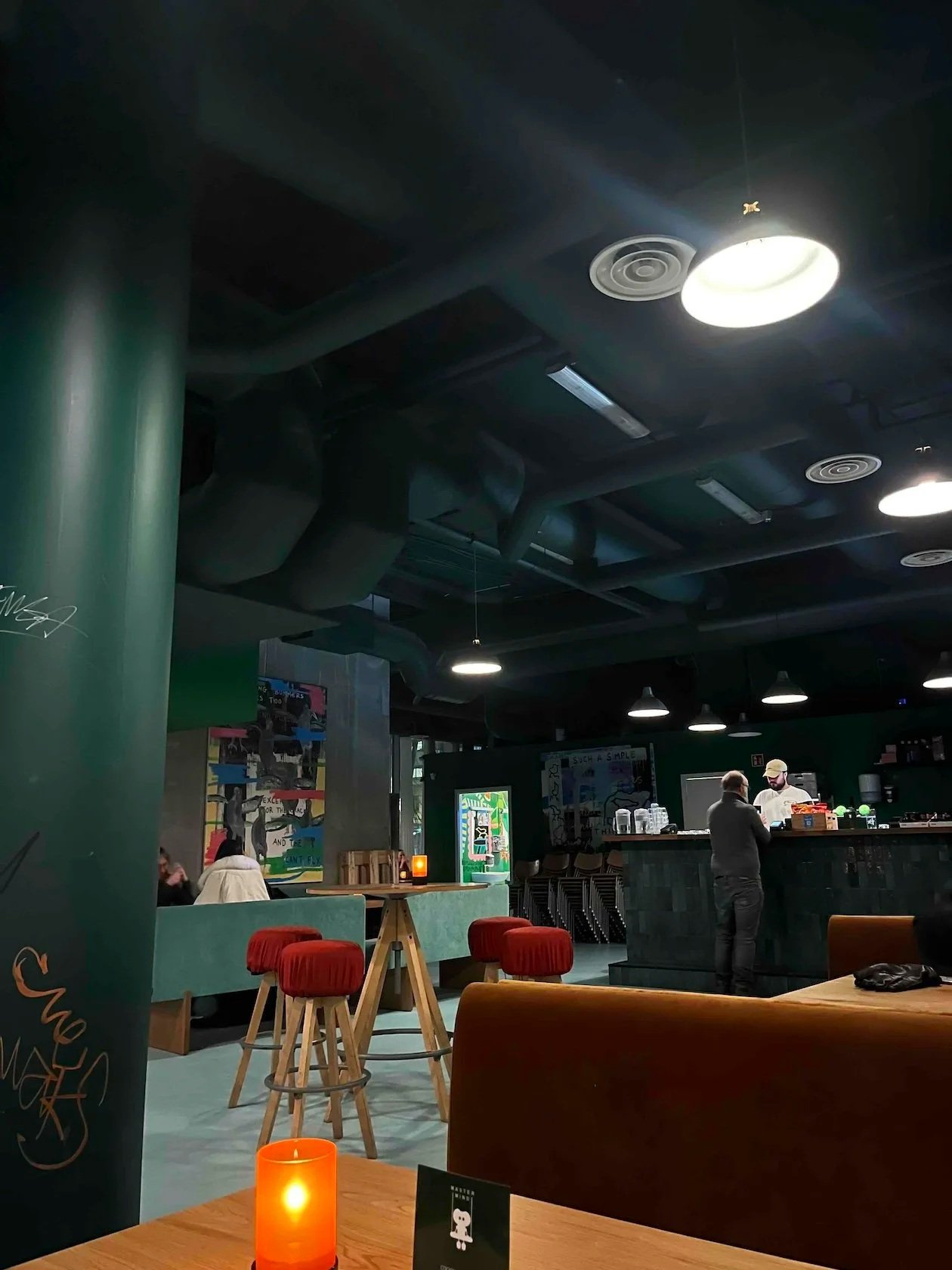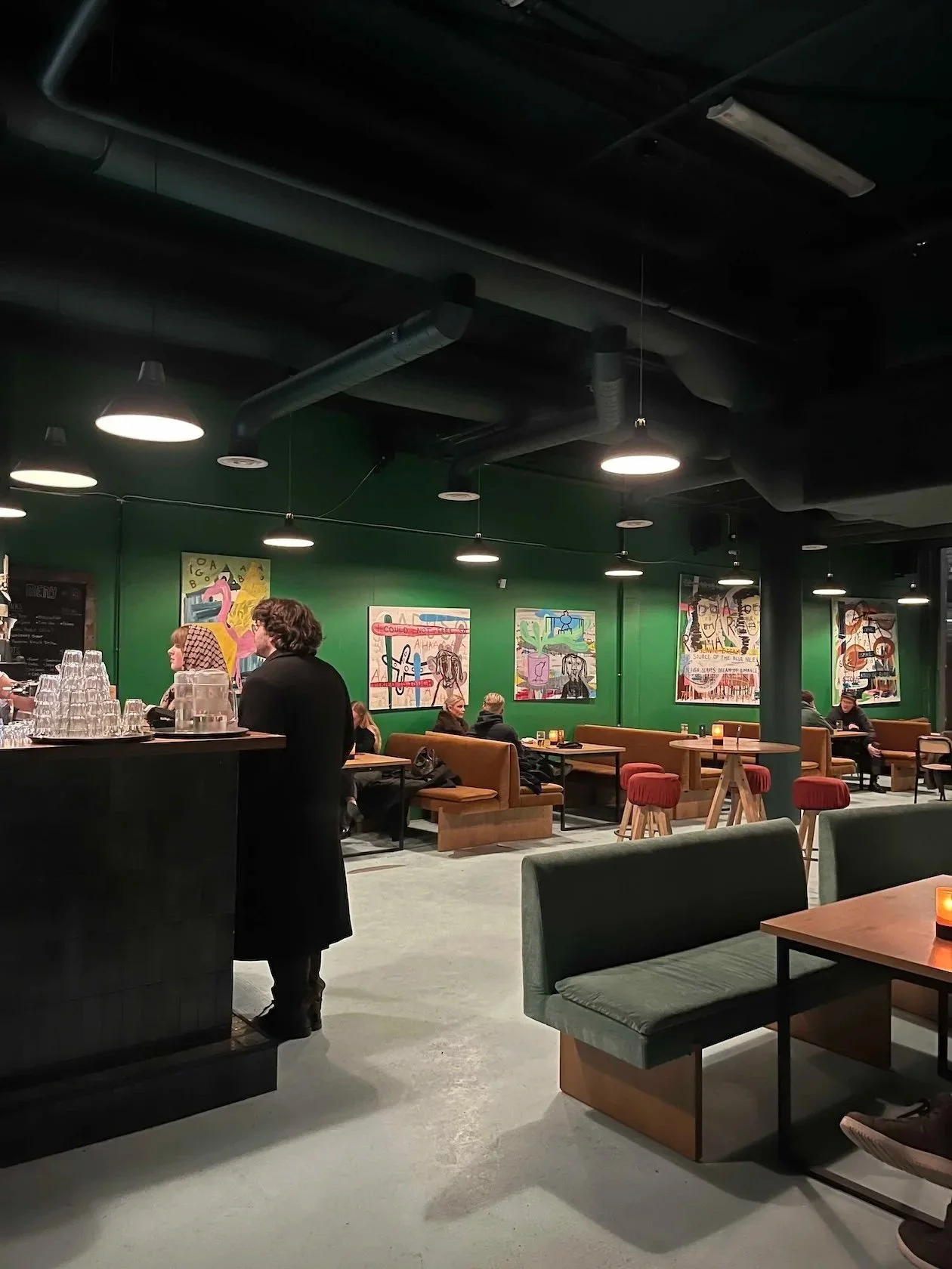 Det skal nevnes at lokalet ligger noe skjult bak en anonym glassdør på Grønland, men innenfor møtes du av et åpent lokale med grønne vegger og kule malerier på veggene. Her er det ikke mangel på sitteplasser, så igjen et sted å notere seg til neste tur vennegjengen har tenkt seg ut!