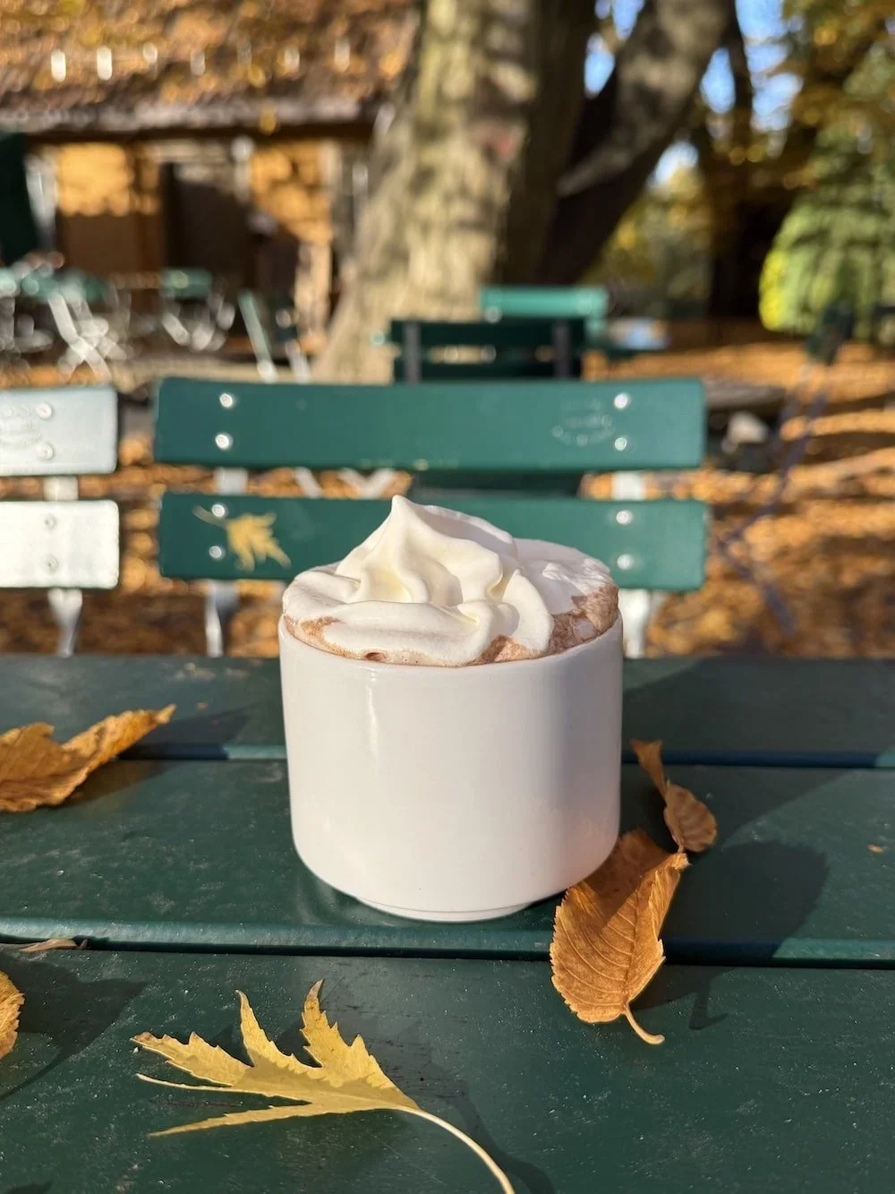 Den serveres i søte kopper, og med en kanelbolle ved siden av blir det ren høstidyll (dypp den gjerne i sjokoladen). Omgitt av nydelige høstfarger blir koppen ekstra hyggelig, enten du sitter inne, ute på en av de mange plassene, eller tar den med på en rusletur gjennom hagen.