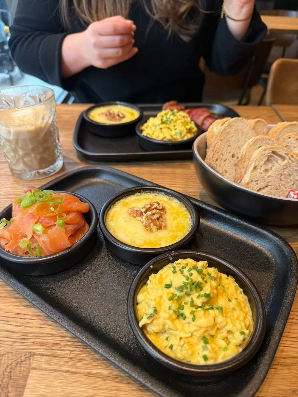 Vi gikk for bakt brie (75 kr), eggerøre (75 kr), røkt laks (80 kr), bacon (80 kr), og brød og smør (65 kr). Eggerøren var kremet, laksen god, en kombinasjon som sjelden slår feil. Den bakte brien med honning fungerte som en søt avslutning på måltidet.