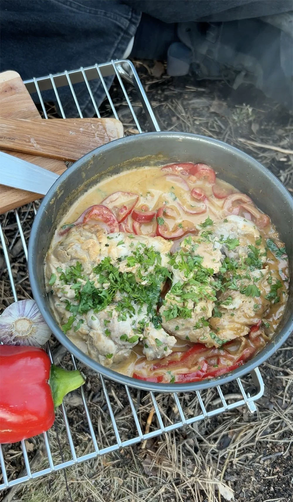 Deretter startet vi på hovedretten. Det putrer godt i både panner og grytter, og lukten av vår gjør absolutt noe med sultfølelsen. Til slutt kunne vi nyte en smakfull kyllinggryte med paprika, fløtesaus, litt chili og urter. Utendørs smaker alt som femstjerners!