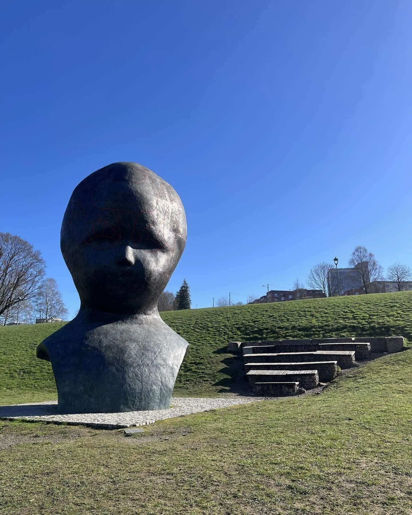 Et av parkens mest karakteristiske trekk er den markante statuen som forestiller et hode (mulig akkurat denne er litt creepy på kveldstid…), og som fungerer som et naturlig blikkfang i landskapet. Torshovdalen egner seg godt for spaserturer, bakkeløp og piknik med vennegjengen.