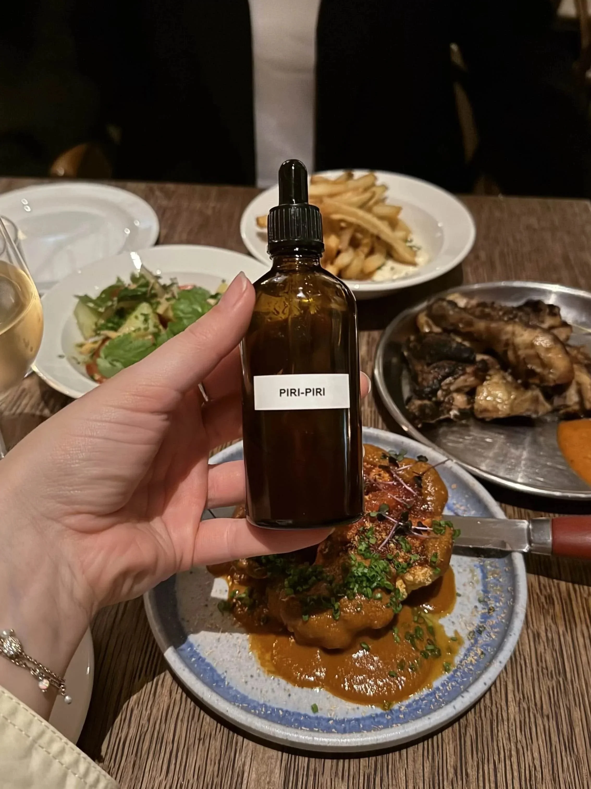 Deretter kom Frango Piri-Piri (299 kroner), grillet kylling på klassisk portugisisk vis, servert med en liten flaske piri piri-olje ved siden av. Å dryppe den over kyllingen ga en ekstra dimensjon og et hint av lekenhet til måltidet.