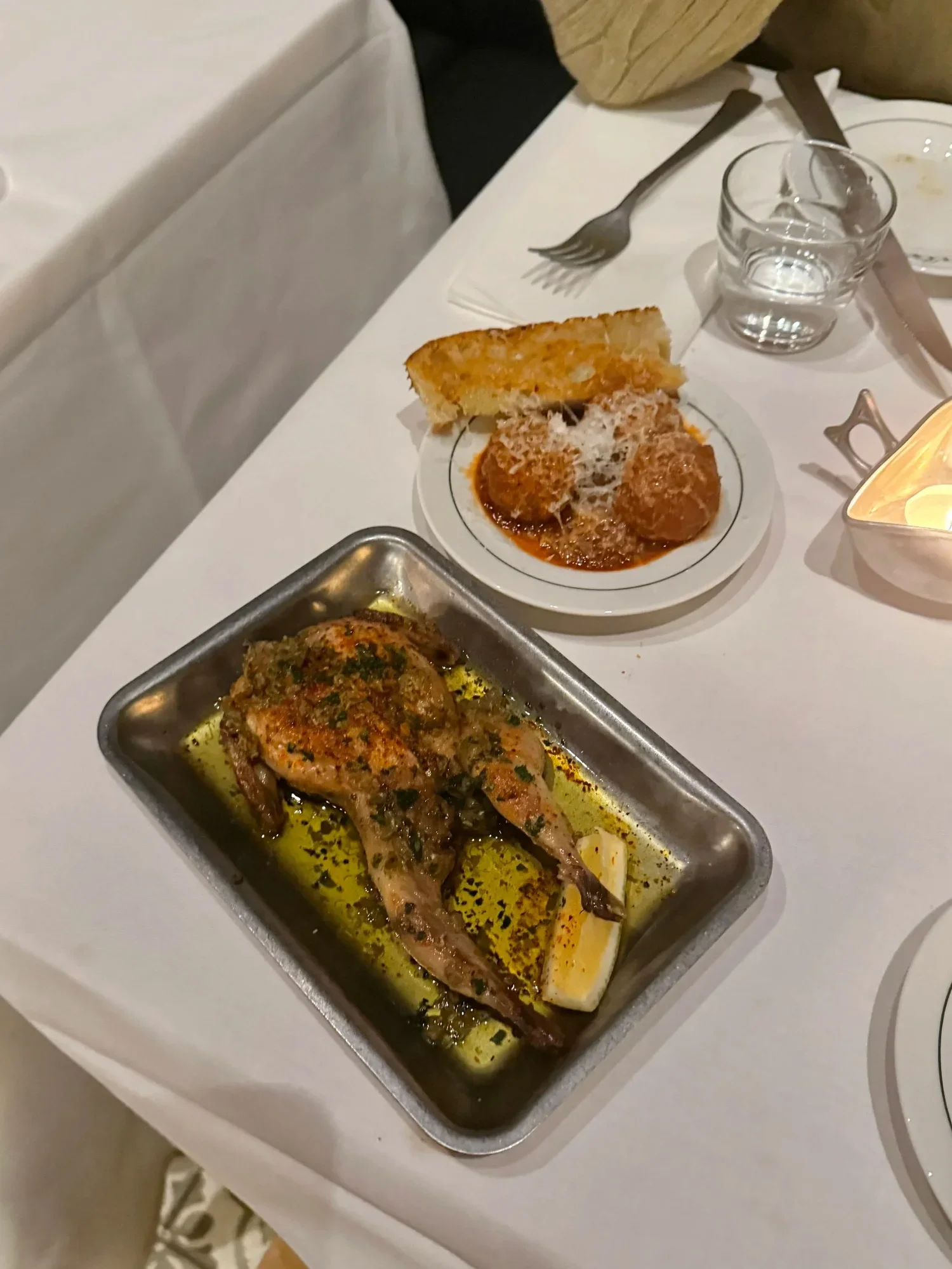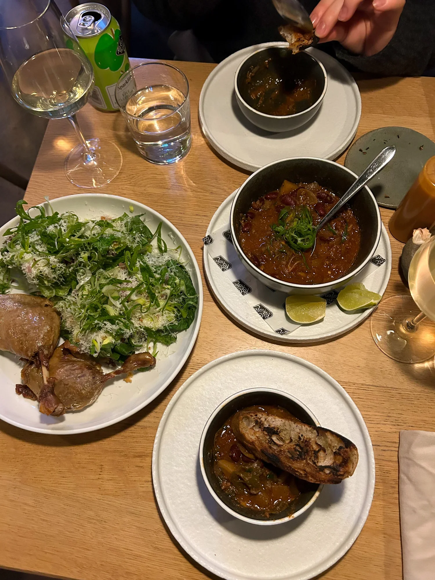 Vi delte alle snacksene til 175 kr, og en toast med hjemmelaget nduja, gruyère, karamellisert løk og salvie (150 kr). I baren har de en stor kasse fylt med flasker du kan få på glass i tre priskategorier (155, 185 og 250 kr). Stedet er et trygt valg for en datenight som ikke trenger å være så komplisert.