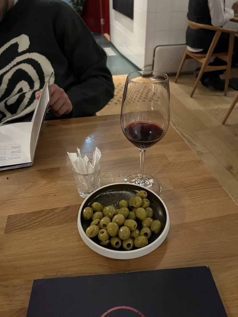 Før vi fikk sett på pizzamenyen, ble vi imidlertid positivt overrasket over den omfattende vinmenyen, som virkelig viste stedets fokus på vin. Vi ønsket å finne et glass med ikke for dyr, men god rødvin. Anbefalingen vi fikk var et glass med rødvinen Cune Crianza 2020 (175 kr). Denne likte undertegnede veldig godt og måtte ta et bilde for å huske den til neste besøk på Vinmonopolet. Vinen passet godt til maten og var veldig tørr, som er en personlig preferanse.